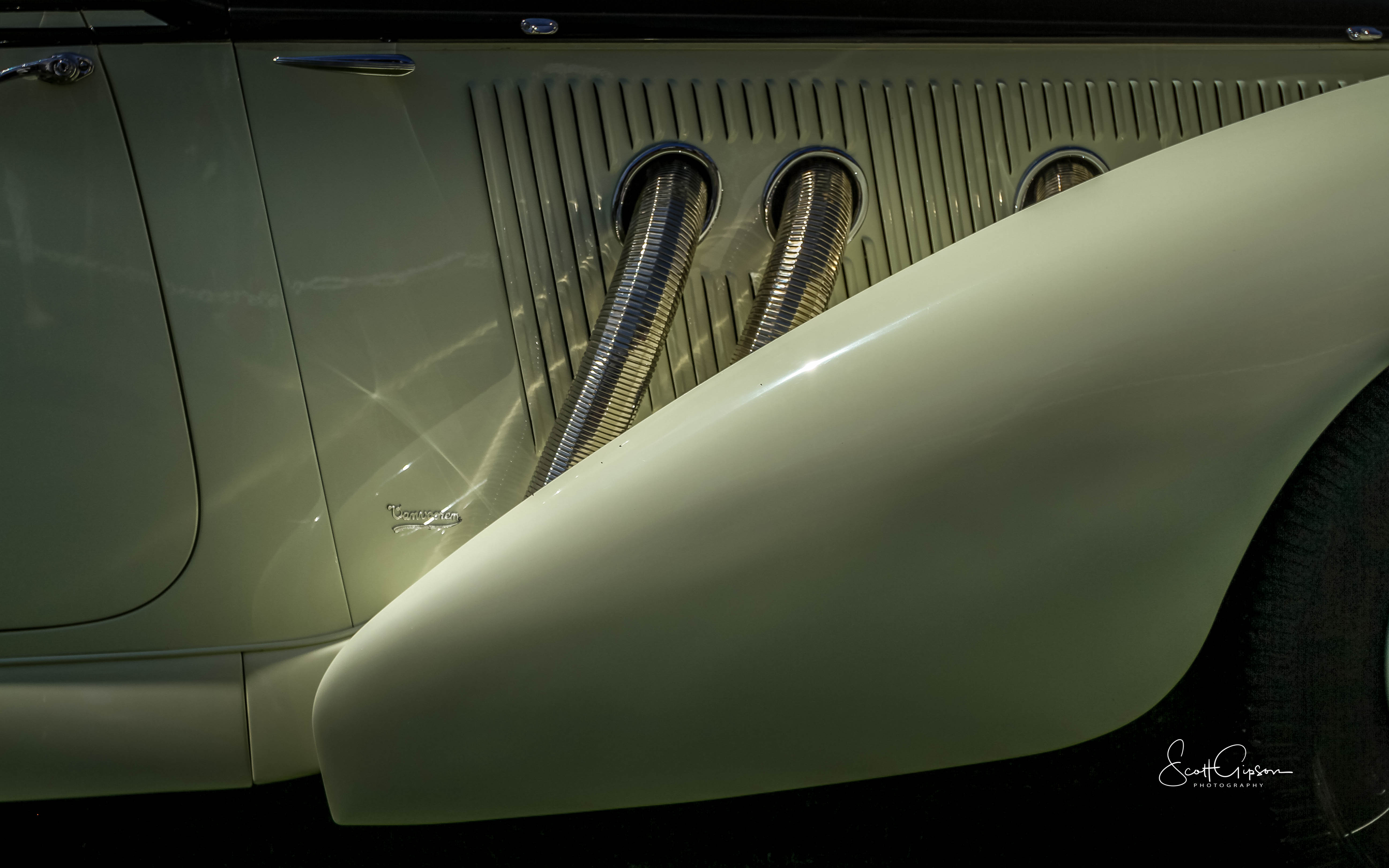 During the 2013 Concourse de Elegance at Pebble Beach, I found this absolutely beautiful classic parked in an area near the edge of the 18th green. It was late in the afternoon and the sun and clouds were dancing around in the sky which gave me a lot of opportunities for different exposures. In the end, I choose this view because the lines of the car and light coming off of the exhaust pipes gave it a sense of classic art deco.
