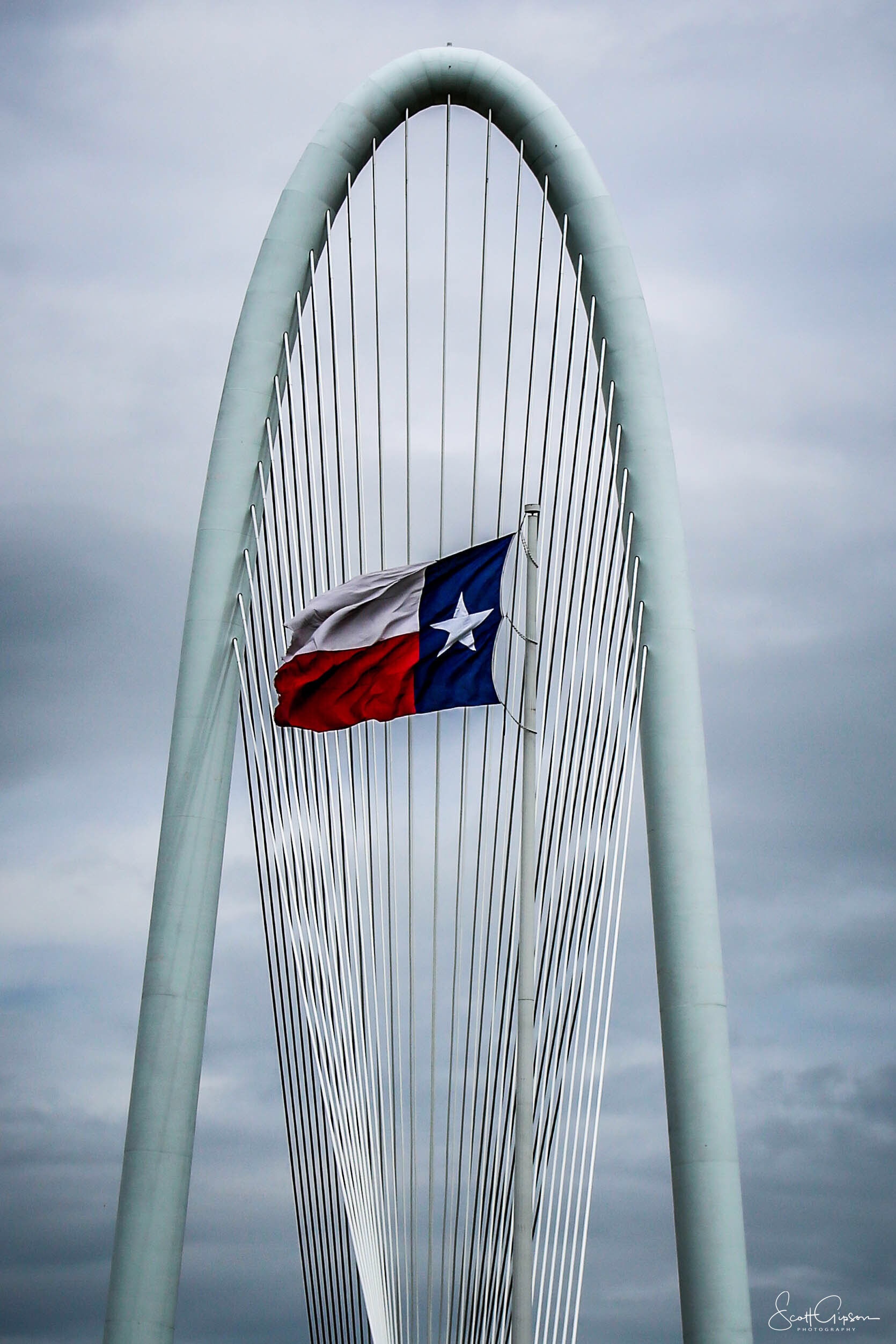 Driving along Singleton Blvd today in Dallas, through Trinity Terrace I spotted the Texas flag in stiff winds on the Margaret Hunt Hill Bridge. I had to go on across the river to make a u-turn and navigate some traffic to find a place to park and then standing in the middle of the crosswalk, took this picture.